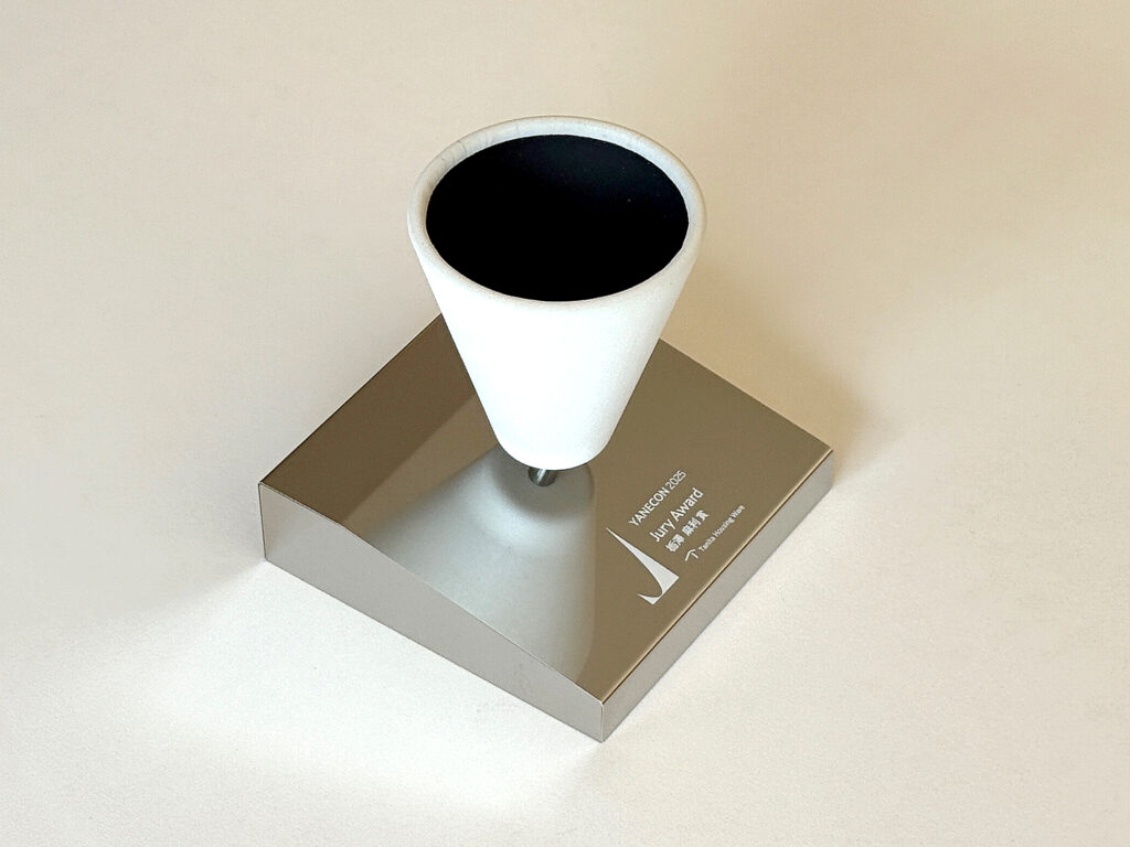 タニタ社の製品ensuiを使ったトロフィ。土台はタニタ社が得意とするハンダ付け加工だそうで、この箱形状がガルバリウム鋼板でできているとのこと。